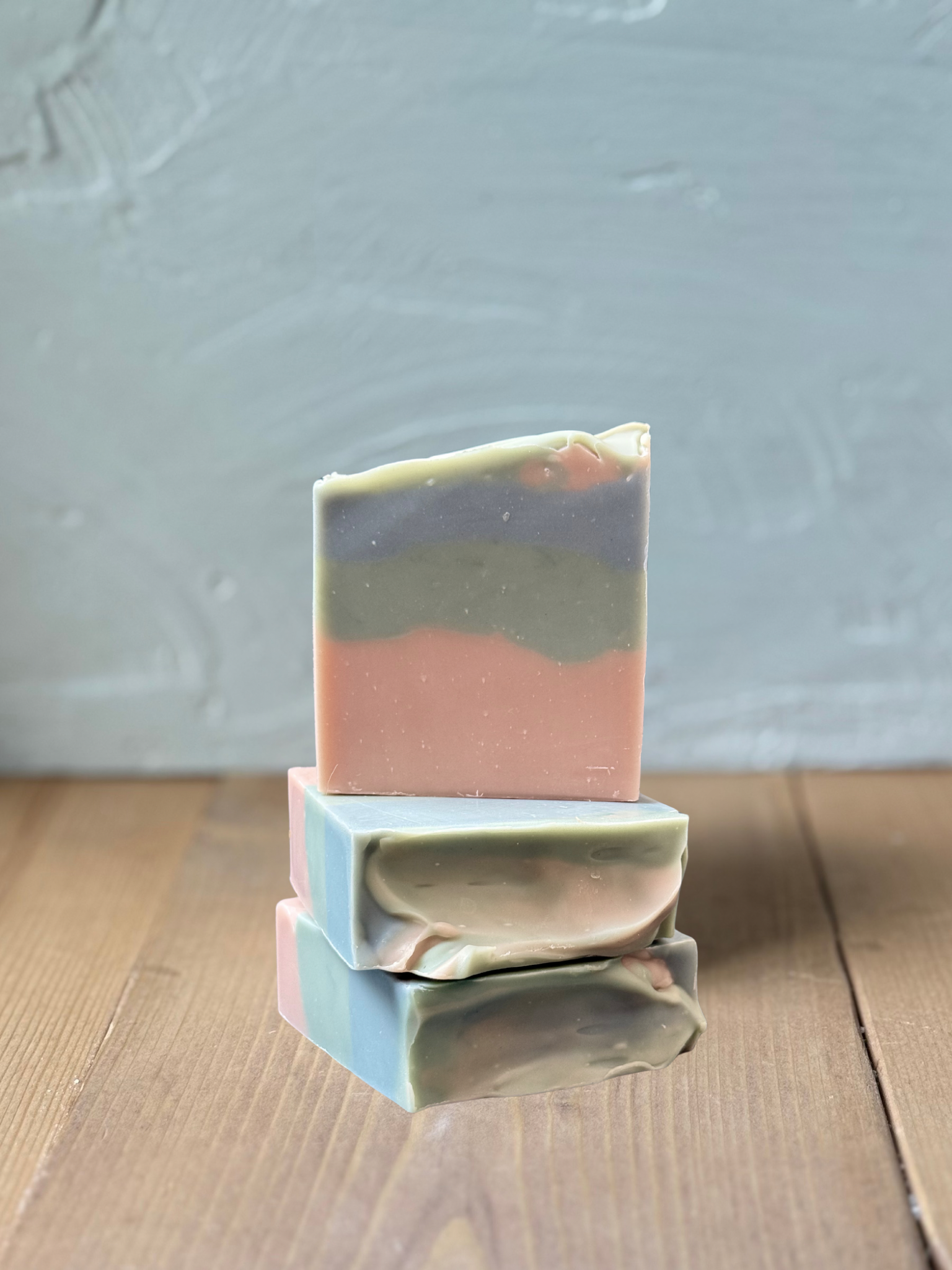 Ingredients: Coconut oil, olive oil, avocado oil, high oleic sunflower oil, shea butter, water, aloe concentrate, sodium hydroxide, castor oil, essential oil, honey, kaolin clay, mica